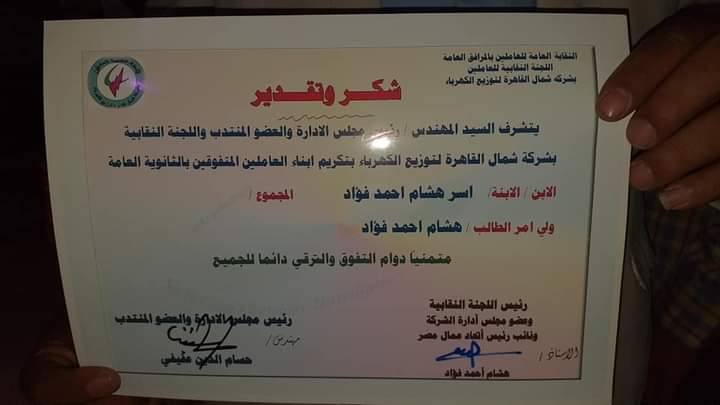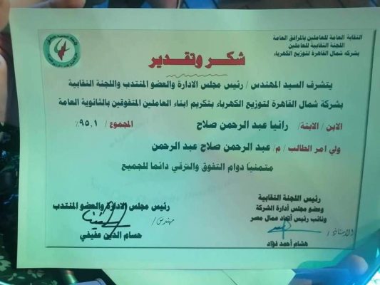 اقامت نقابة شمال القاهرة لتوزيع الكهرباء احتفالية لتكريم المحاربين القدامى من أبناء الشركة بالاضافة الي تكريم أبناء العاملين الاوائل بالثانوية العامة