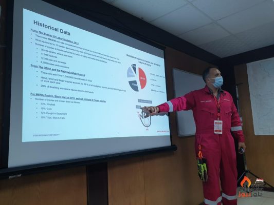 ثم أنتقل الفريق الي المكتب الإداري بحقول دارا وغرب بكر وتم عقد ورشة عمل مع مسئولي الإدارات الفنية بالحقول لنقل التجربة من خلال عرض الأدوات والتقنيات التي استحدثتها هاليبرتون خلال حملة حماية ومنع إصابات الأيدي والأصابع، وتناقش الحضور في التقنيات التي يمكن إستخدامها لتغيير ثقافة العاملين ووسائل الحماية وتأمين الأعمال التي تنجز بإستخدام الأيدي والأصابع. وتم إتخاذ كافة التدابير والإجراءات الإحترازية للحماية من فيروس الكورونا.