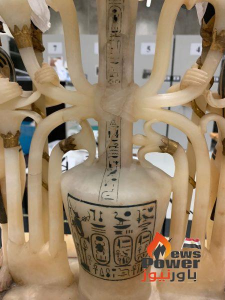 وأضاف أن ال ١٦ قطعة الخاصة بكنوز الملك الشاب تتكون من مجموعة متميزة من الأواني المصنوعة من الألباستر و التي يتم الآن تثبيتها داخل الفتارين الخاصة بها بقاعة الملك توت عنخ آمون، وفقاً لسيناريو العرض المقرر مسبقاً.