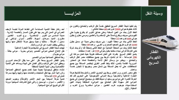 • إنشاء مناطق لوجيستية جديدة حيث تخدم جميع المناطق الصناعية والزراعية المار بها لنقل المنتجات والخامات منها وإليها وإليها بسرعة تصل إلى 120 كم/ساعة