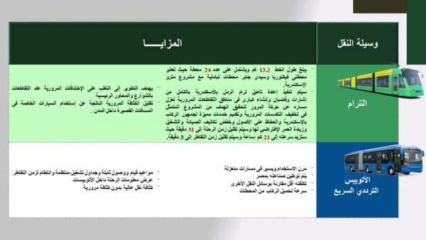 أصدرت وزارة النقل تقريراً إعلامياً لتوضيح بعض الحقائق الخاصة بمشروعات النقل الجماعي الأخضر المستدام صديق البيئة التي يتم تنفيذها حالياً من حيث الأهمية والخصائص والأسس والمعايير التي تحدد اختيار تنفيذ كل منها .