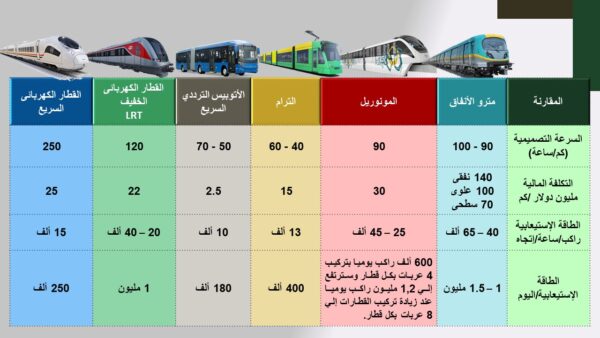 2. التكلفة المالية : 140 مليون دولار لكل كيلو متر نفقي – 100 مليون دولار لكل كيلو متر علوي – 70 مليون دولار لكل كيلو متر سطحي .