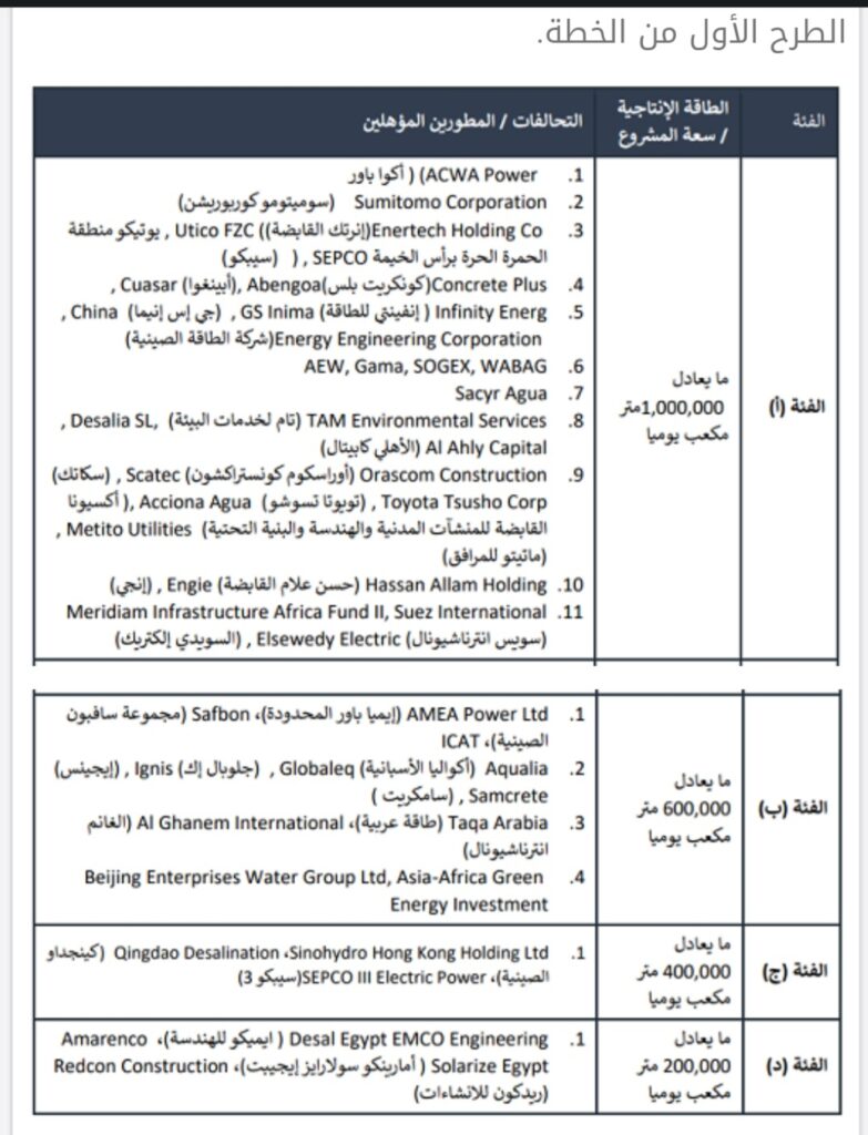 وأضاف صندوق مصر السيادي، أنه تم تصنيف التحالفات المتأهلة إلى 4 فئات حسب خبراتهم السابقة في عدد من مشروعات تحلية المياه محليًا وعالميًا.
