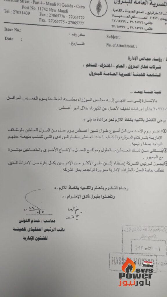 ارسل المحاسب حسام التونى نائب رئيس هيئة البترول للشئون الإدارية خطابا رسميا الى جميع الشركات المشتركة و العامة والمساهمة التابعة للهيئة باعتبار يوم الاحد من كل أسبوع طوال اغسطس الجارى هو يوم عمل من المنزل وفيما يلى نص الخطاب :