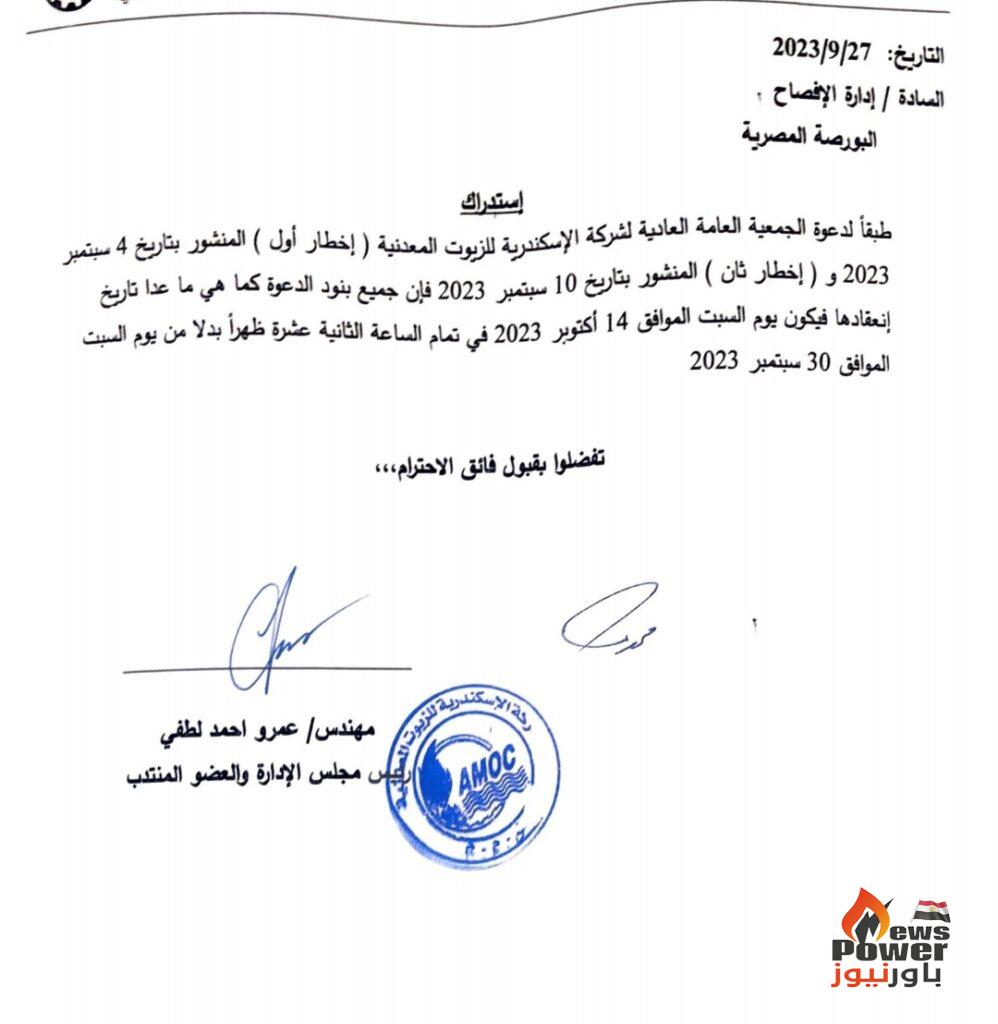 وليد البهنساوي اخطرت شركة الاسكندرية للزيوت المعدنية ” اموك ” البورصة المصرية اليوم بتغير موعد انعقاد الجمعية العمومية المقرر لها السبت المقبل الي السبت 14 اكتوبر القادم