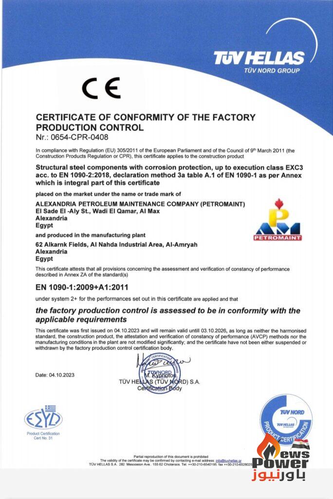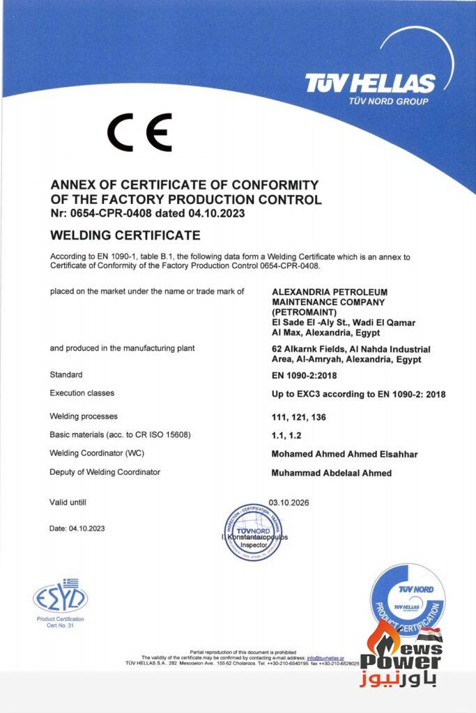 حصلت ورش شركة الاسكندرية للصيانة البترولية ( بترومنت) على شهادة الــCE MARK لاعتماد اللحامات وتصنيع الهياكل المعدنية طبقا للكود الاوربى EN1090-1 و EN3834-2