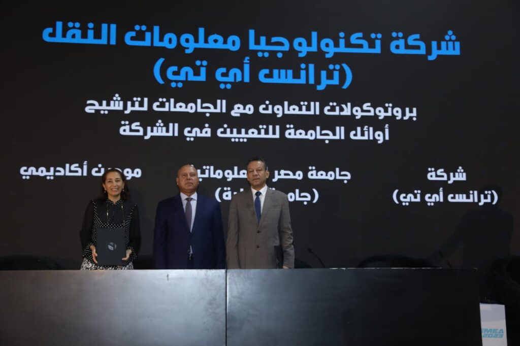 وشهد الوزير ايضا توقيع بروتوكول تعاون بين شركة تكنولوجيا معلومات النقل (ترانس آي تي) الذراع التكنولوجي لوزارة النقل وجامعه مودرن أكاديمي احدي الجامعات المصرية بشأن التدريب الميداني لاوائل كلية علوم الكمبيوتر وتكنولوجيا الادارة وتأهيلهم لسوق العمل والاستفادة من الاكاديمية في دعم البحث العلمي للشركة، حيث قام بالتوقيع كل من المهندس خالد عطية رئيس مجلس ادارة شركة تكنولوجيا معلومات النقل (ترانس آي تي) الذراع التكنولوجي لوزارة النقل و الدكتور / محمود السيد عميد مودرن اكاديمي.