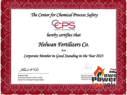 انضمت شركة حلوان للأسمدة كأول شركة مصرية لعضوية مركز سلامة العمليات الكيميائية Centre for Chemical process Safety (CCPS