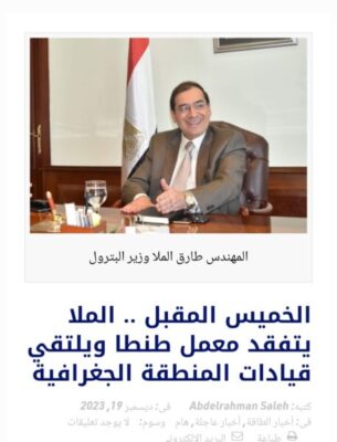 تأكيداً لانفراد باور نيوز أول امس تفقد المهندس طارق الملا وزير البترول والثروة المعدنية ، المنطقة الجغرافية البترولية بطنطا والتى تضم مصفاة تكرير تابعة لشركة القاهرة لتكرير البترول ومحطات ومستودعات شحن وتعبئة وتخزين تابعة لشركات أنابيب البترول ومصر والتعاون للبترول وبتروجاس وما تشهده المنطقة من مشروعات تطوير لرفع كفاءتها ، حيث تؤمن المنطقة إمدادات البنزين والسولار والبوتاجاز لمحافظات الغربية والقليوبية والمنوفية والبحيرة وكفر الشيخ ودمياط.
