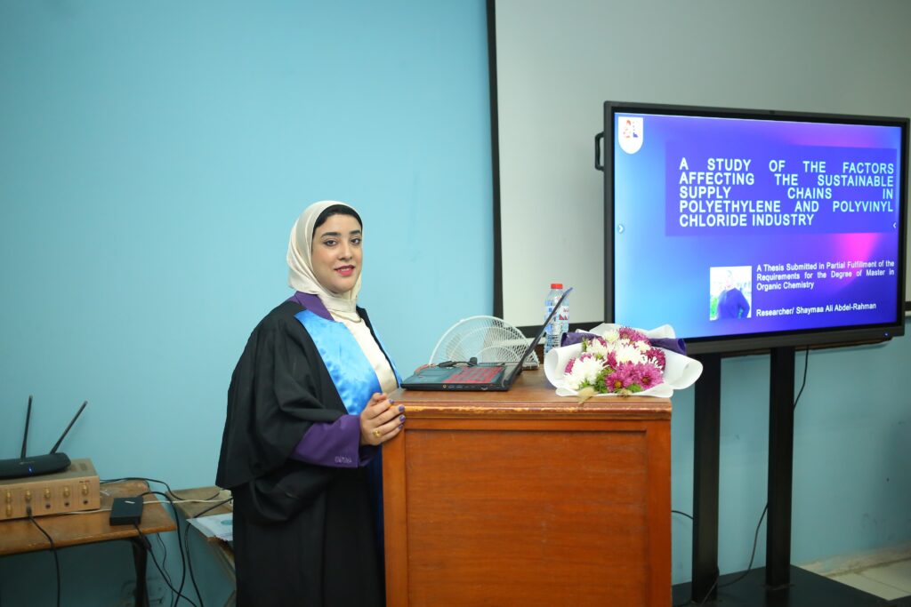 حصلت الباحثة شيماء علي عبد الرحمن بشركة الخدمات اللوجستية للبتروكيماويات pls على درجة الماجستير فى العلوم تخصص الكيمياء العضوية بكلية العلوم جامعة الإسكندرية عن رسالة بعنوان “دراسة حول العوامل التي تؤثر على سلاسل الإمداد المستدامة فى صناعة البولى إيثلين والبولى فينيل كلوريد”.