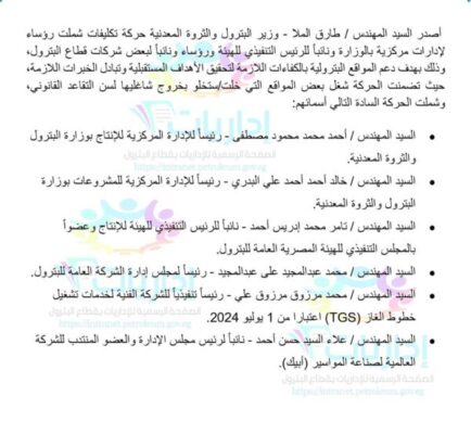أصدر المهندس طارق الملا – وزير البترول والثروة المعدنية حركة تكليفات شملت رؤساء لإدارات مركزية بالوزارة ونائباً للرئيس التنفيذي للهيئة ورؤساء ونائباً لبعض شركات قطاع البترول، وذلك بهدف دعم المواقع البترولية بالكفاءات اللازمة لتحقيق الأهداف المستقبلية وتبادل الخبرات اللازمة حيث تضمنت الحركة شغل بعض المواقع التي خلت / ستخلو بخروج شاغليها لسن التقاعد القانوني، وشملت الحركة السادة التالي أسمائهم: