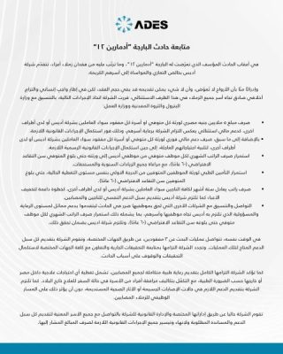 أعلنت شركة اديس في بيان عاجل وهام تطورات حادث البارجة ادنارين 12 وقالت اديس في بيانها أنه