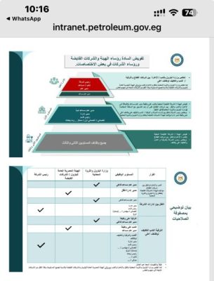 أعلنت وزارة البترول والثروة المعدنية عن تفويض السادة رؤساء الهيئة والشركات القابضة ورؤساء الشركات في بعض الاختصاصات، وذلك في إطار المحور الخامس من إستراتيجية وزارة البترول والثروة المعدنية، والمتمثل في ضرورة المحافظة على العنصر البشري وتنميته، ورفع كفاءة العمل، وتماشياً مع خطط التنمية المستدامة ضمن رؤية مصر 2030، وتطبيقاً لمبدأ الشفافية وتيسير الإجراءات وتمكين رؤساء الشركات.