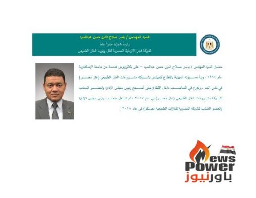 السيد المهندس / ياسر صلاح الدين حسن عبد السيد – رئيساً تنفيذياً مديراً عاماً لشركة فجر الأردنية المصرية لنقل وتوريد الغاز الطبيعي .
