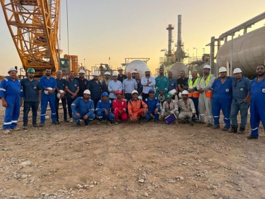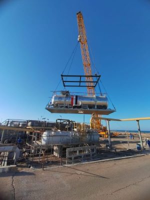 تصميم و تصنيع وتركيب وحدة إزالة المياه بإستخدام تقنية فصل بالمجالات الكهربائية لتكسير المستحلبات وفصل المياه بنسبة جودة 99.5 % بمواصفات قياسية: سعة 55000 برميل / يوم وابعاد طول 23 متر و عرض 8 متر وزن 107 طن – Electrostatic Heater Treater.