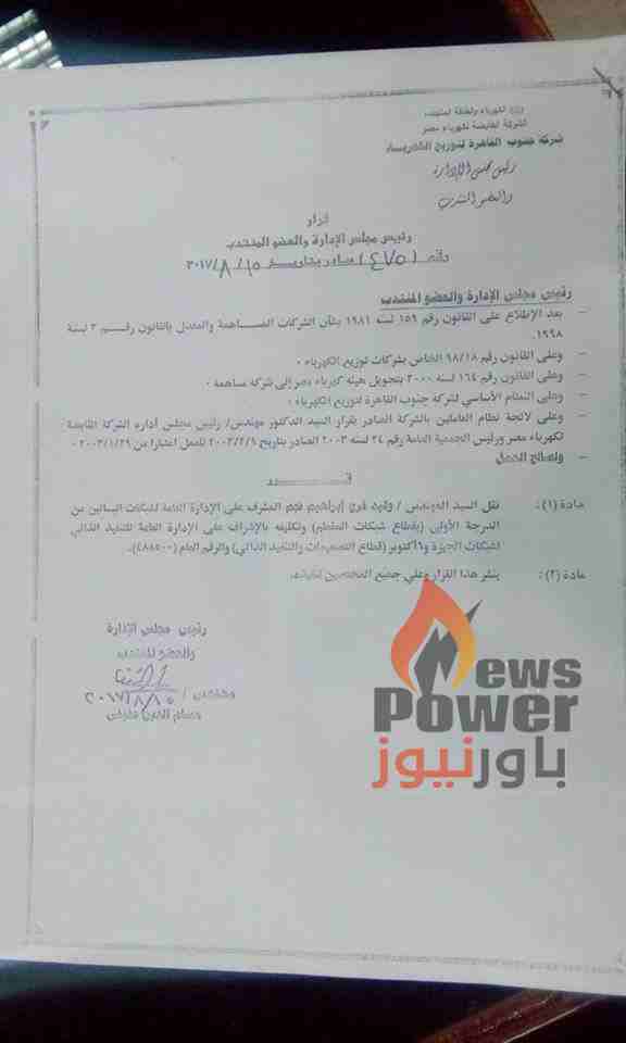 اصدر المهندس حسام عفيفي رئيس مجلس الادارة والعضو المنتدب لشركة جنوب القاهرة لتوزيع الكهرباء حركة تنقلات شملت 5 قيادات من مسئولي الشبكات الفنية وجاءت القرارات كالتالي: