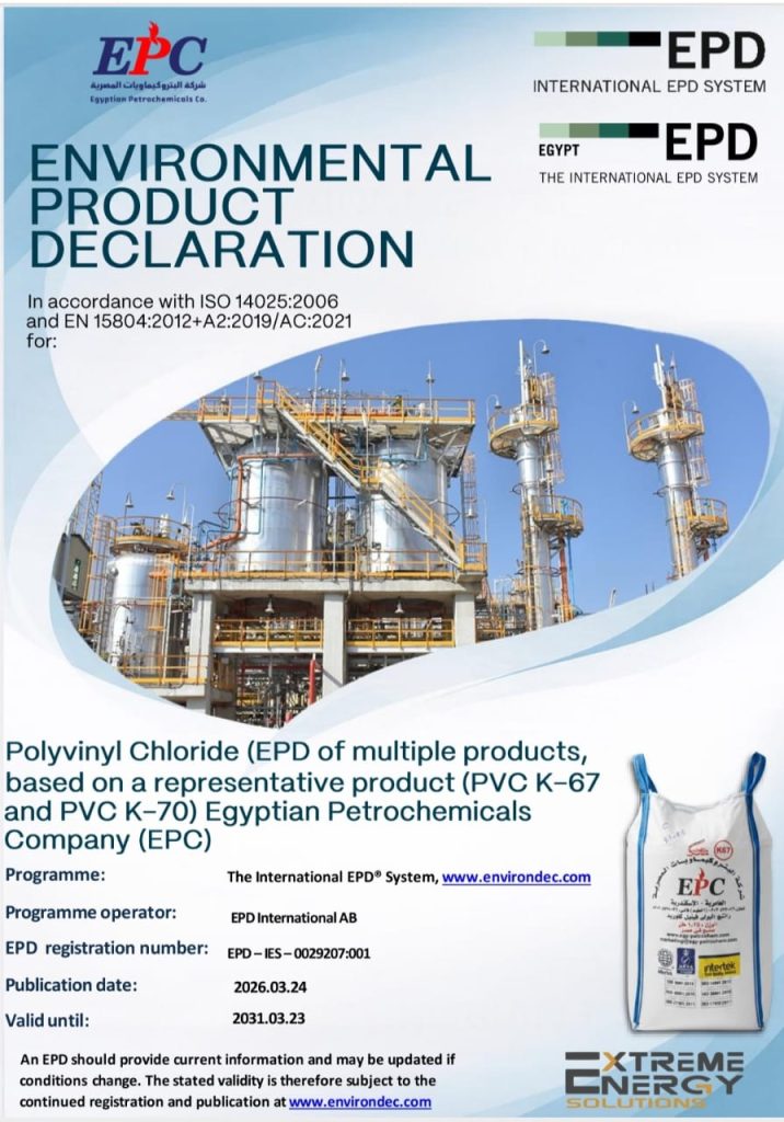 نجاح غير مسبوق لشركة البتروكيماويات المصرية بقيادة الكيميائي/ أحمد موقع – رئيس مجلس الإدارة – أضافت الشركة إنجازًا جديدًا يُضاف إلى سلسلة إنجازاتها، وذلك من خلال الحصول على التحقق الدولي لتقارير الإفصاح البيئي (EPD) لمنتجاتها من مادة PVC بدرجاته K67 / K70، ومادة الصودا الكاوية (Caustic Soda)، مع التنسيق لنشر هذه التقارير عالميًا، بالتعاون مع شركة «إكستريم إنيرچي جروب».