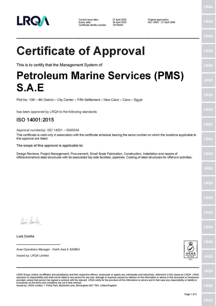 ويعكس تجديد هذه الشهادة ثقافة العمل المؤسسي داخل شركة خدمات البترول البحرية PMS ، والتي ترتكز على الوعي البيئي ، إلى جانب السعي الدائم نحو التميز والتطوير المستمر في مختلف مجالات العمل.