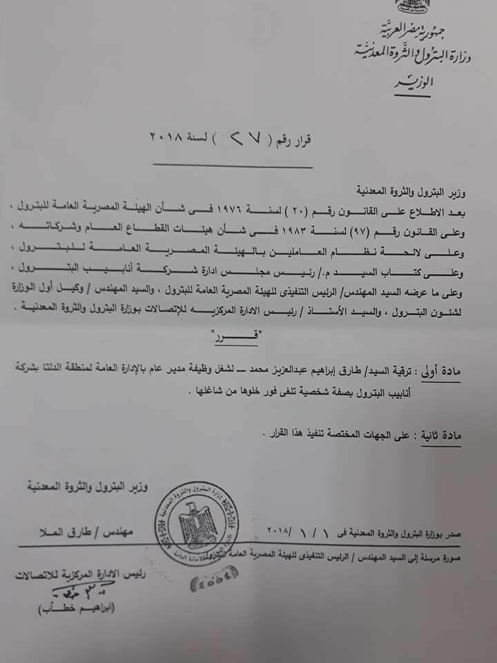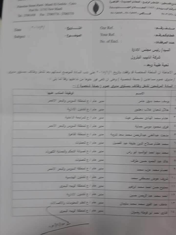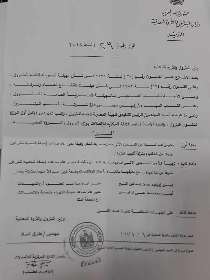 وقد تقدمت النقابة العامة بالشكر للمهندس عبد المنعم حافظ رئيس مجلس الإدارة على سعيه الدؤوب وحرصه الدائم علي مصلحة العاملين بالشركة كما تقدمت النقابة بالشكر لمدير عام الشئون الإدارية وجميع المسئولين بالشئون الإدارية على المجهود الرائع المبذول لانهاء حركة الترقيات والندب وينفرد موقع باور نيوز بنشر قرارات التعيين واسماء المترقين بالشركة: