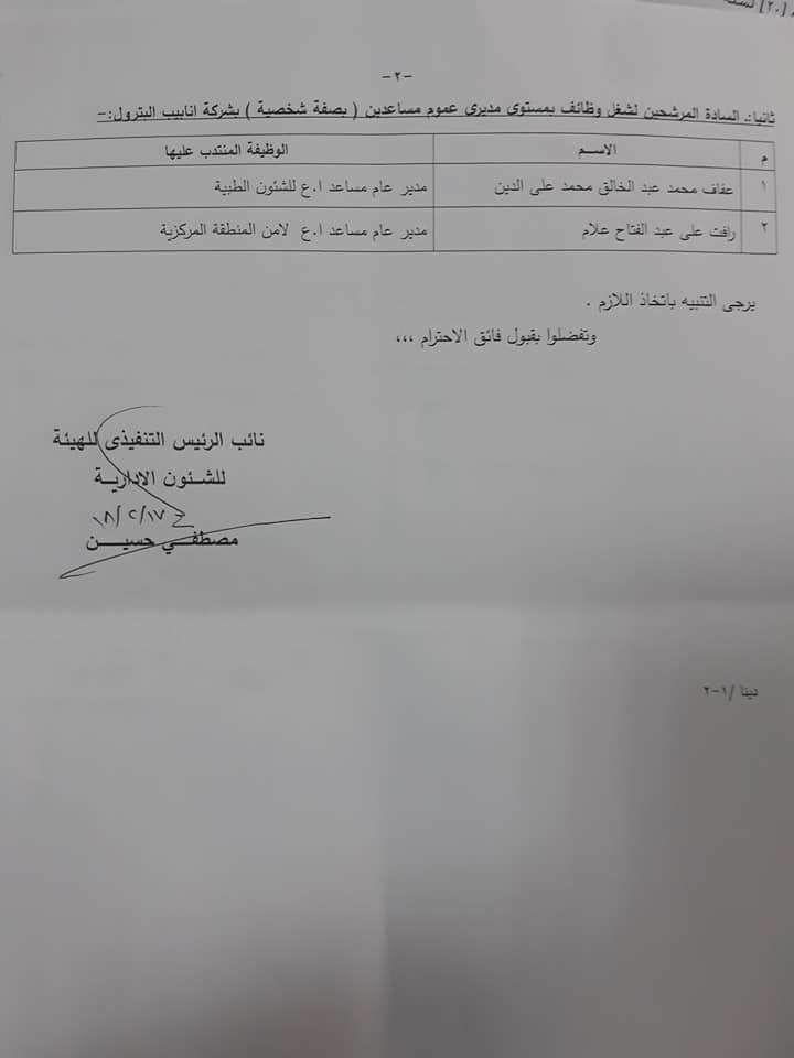 اجتمعت اليوم لجنة شئون العاملين بشركة انابيب البترول برئاسة المهندس عبدالمنعم حافظ رئيس مجلس الإدارة وتم إعتماد حركة الترقيات والندب للعاملين المستوفين فى 2017/9/30 وكذلك الموافقة على منح العلاوة التشجيعية للعاملين الحاصلين على دراسات عليا على أن يكون استحقاق العلاوه للجميع فى2018/3/1 كما وردت كشوف حركة الترقيات والندب للإدارة العليا مديرى عموم ومديرى عموم مساعدين لبعض السادة العاملين والمعتمدة فى 2018/1/1