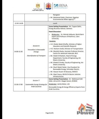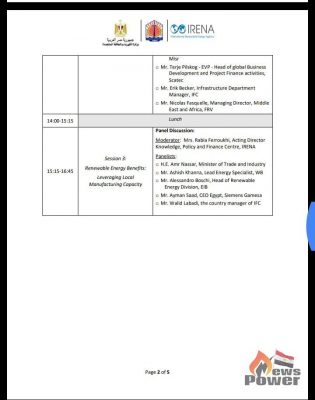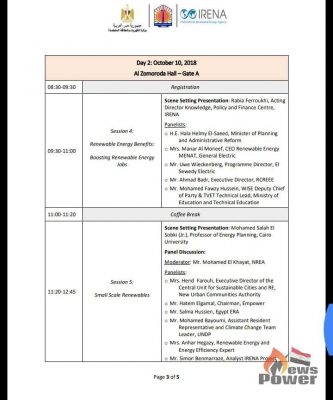 تشارك كل من وزارة الكهرباء والطاقة المتجددة وهيئة الطاقة الجديدة والمتجددة والوكالة الدولية للطاقة المتجددة (أيرينا) في تنظيم المؤتمر الأول للطاقة المتجددة الذي سيعقد بالقاهرة في الفترة من 9-11 أكتوبر 2018. حيث يهدف المؤتمر – الذي سينعقد على مدار ثلاثة أيام- إلى تنمية استخدام مصادر الطاقات المتجددة في البلاد، بالإضافة إلى الاعلان عن التقرير الذي أعدته أيرينا عن مستقبل الطاقة المتجددة في مصر ، وهو بمثابة تقييم واف و شامل عن إمكانيات الطاقة المتجددة بمصر. وينفرد الموقع بنشر جلسات المؤتمر والاجندة الخاصة خلال ايام المؤتمر.