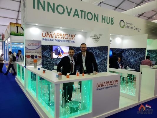 وقام حازم حليم، الرئيس التنفيذى لشركة يونى أرمور، بعرض صمامات وأغطية أنابيب البترول، والدعامات المعلقة، والتى تسهم فى تثبيت الأنابيب بشكل آمن وبطريقة سلسلة وتختصر كثيرا من الوقت عند تركيبها فى مواقع الاستكشافات البترولية والمصنوع بالكامل من البلاستيك عالي الكثافة القابل لإعادة التدوير.