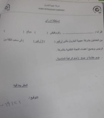 طلب المهندس عصام القفاص رئيس شركة عجيبة للبترول من مساعدي رئيس الشركة ومديرو عموم الادارات العامة اجراء استطلاع رأي حول سحب الثقة من رئيس واعضاء اللجنة النقابية بالشركة بناءً علي الطلب المقدم من بعض اعضاء الجمعية العمومية والعاملين بالشركة.
