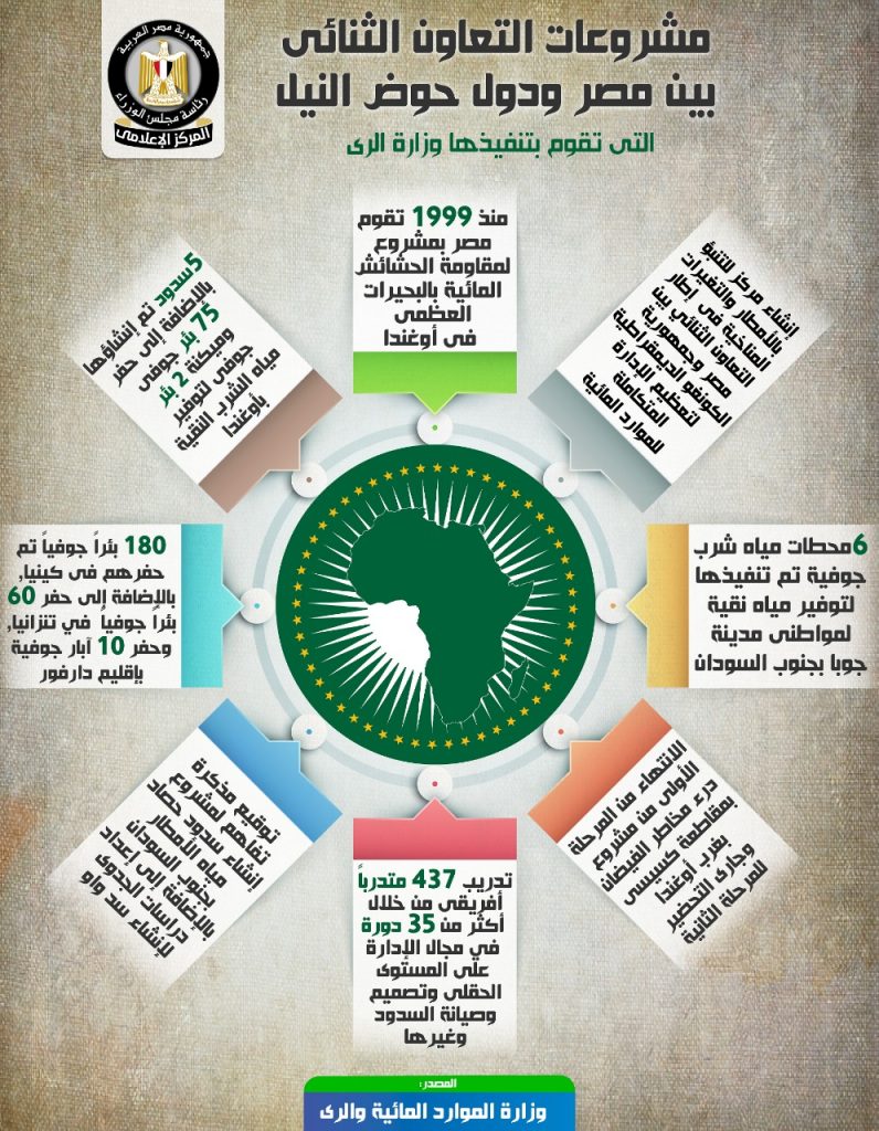 كما كشف المركز الإعلامي لمجلس الوزراء عن أبرز مشروعات التعاون الثنائي بين مصر ودول حوض النيل التي تقوم بتنفيذها وزارة الري، والتي تمثلت في إنشاء 5 سدود، وحفر 75 بئر جوفي, وميكنة 2 بئر جوفي لتوفير مياه الشرب النقية بأوغندا، وأيضاً تم حفر 180 بئر جوفي في كينيا, و60 بئر جوفي في تنزانيا, و10 آبار جوفية بإقليم دارفور، فضلاً عن تنفيذ 6 محطات مياه شرب جوفية لتوفير مياه نقية لمواطني مدينة جوبا بجنوب السودان، وتدريب 437 متدرب أفريقي من خلال أكثر من 35 دورة في مجال الإدارة على المستوى الحقلي وتصميم وصيانة السدود وغيرها.