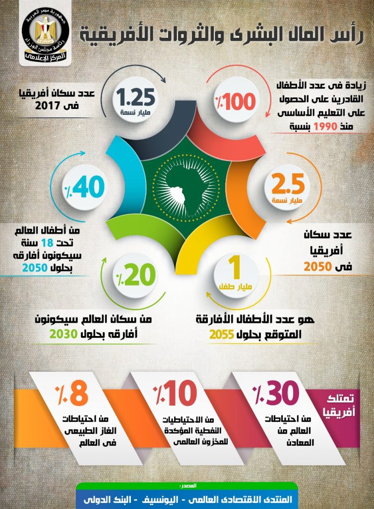 وفي إطار إلقاء المركز الإعلامي لمجلس الوزراء الضوء على رأس المال البشري لأفريقيا، فقد أوضح المركز أن عدد سكان أفريقيا بلغ نحو 1.25 مليار نسمة عام 2017، ومن المتوقع أن يكون 20% من سكان العالم أفارقة بحلول 2030، وأن يصل عدد السكان إلى 2.5 مليار نسمة عام 2050، كذلك زاد عدد الأطفال القادرين على الحصول على التعليم الأساسي منذ 1990 بنسبة 100%، ومن المتوقع أن يكون40% من أطفال العالم تحت 18 سنة أفارقه بحلول 2050، فيما سيصل عدد الأطفال بأفريقيا إلى مليار طفل بحلول 2055.