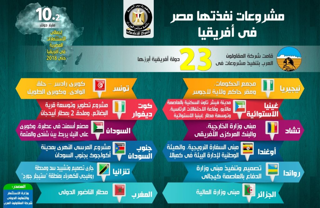 وأشار المركز الإعلامي لمجلس الوزراء إلى أن شركة المقاولون العرب قامت بتنفيذ مشروعات بـ 23 دولة أفريقية، أبرزها إنشاء مجمع الحكومات, ومقر حاكم ولاية لاجوس بنيجيريا، وإنشاء مدينة فيش تاون السكنية بالعاصمة مالابو, وقاعة الاحتفالات الرئاسية وتوسعة مطار غينيا الاستوائية، وكذلك إنشاء مبنى وزارة الخارجية, والبنك المركزي الأفريقي بتشاد، وإنشاء مبنى السفارة النرويجية والهيئة الوطنية لإدارة البيئة في كمبالا بأوغندا، وأيضاً تصميم وتنفيذ مبنى وزارة الدفاع بالعاصمة الرواندية كيجالي، ومطار الناضور الدولي بالمغرب.