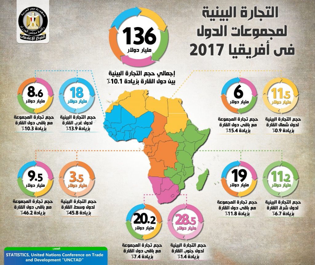 وأكد المركز الإعلامي لمجلس الوزراء، أن إجمالي حجم التجارة البينية بين دول القارة عام 2017 بلغ 136 مليار دولار بزيادة قدرها 10.1%، مشيراً إلى أن حجم التجارة البينية لدول جنوب القارة بلغ نحو 28.5 مليار دولار بزيادة قدرها 1.4%، أما عن حجم تجارة مجموعة دول الجنوب مع باقي دول القارة فقد وصل إلى 20.2 مليار دولار بزيادة قدرها 7.4%، وكذلك بلغ حجم التجارة البينية لدول غرب القارة نحو 18 مليار دولار بزيادة قدرها 13.9%، في حين سجل حجم تجارة مجموعة دول الغرب مع باقي دول القارة نحو 8.6 مليار دولار بزيادة قدرها 10.3%.