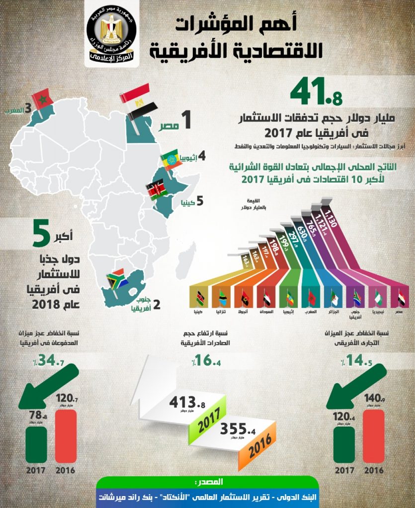 وقد أكد المركز الإعلامي لمجلس الوزراء، أن حجم تدفقات الاستثمار في أفريقيا بلغ 41.8 مليار دولار عام 2017، وأن مصر تتصدر الدول الأفريقية الأكثر جذباً للاستثمار وفقاً لبنك “راند ميرشنت” عام 2018 ، وذلك بعد أن كانت تحتل المركز السادس عام 2014، ثم تلاها في تقرير عام 2018 جنوب أفريقيا، والمغرب، وأثيوبيا، بالإضافة إلى كينيا ، وتمثلت أبرز مجالات الاستثمار في السيارات وتكنولوجيا المعلومات والتعدين والنفط، حيث تمتلك أفريقيا 30% من احتياطات العالم من المعادن،و10% من الاحتياطيات النفطية المؤكدة للمخزون العالمي، فضلاً عن 8% من احتياطات الغاز الطبيعي في العالم.