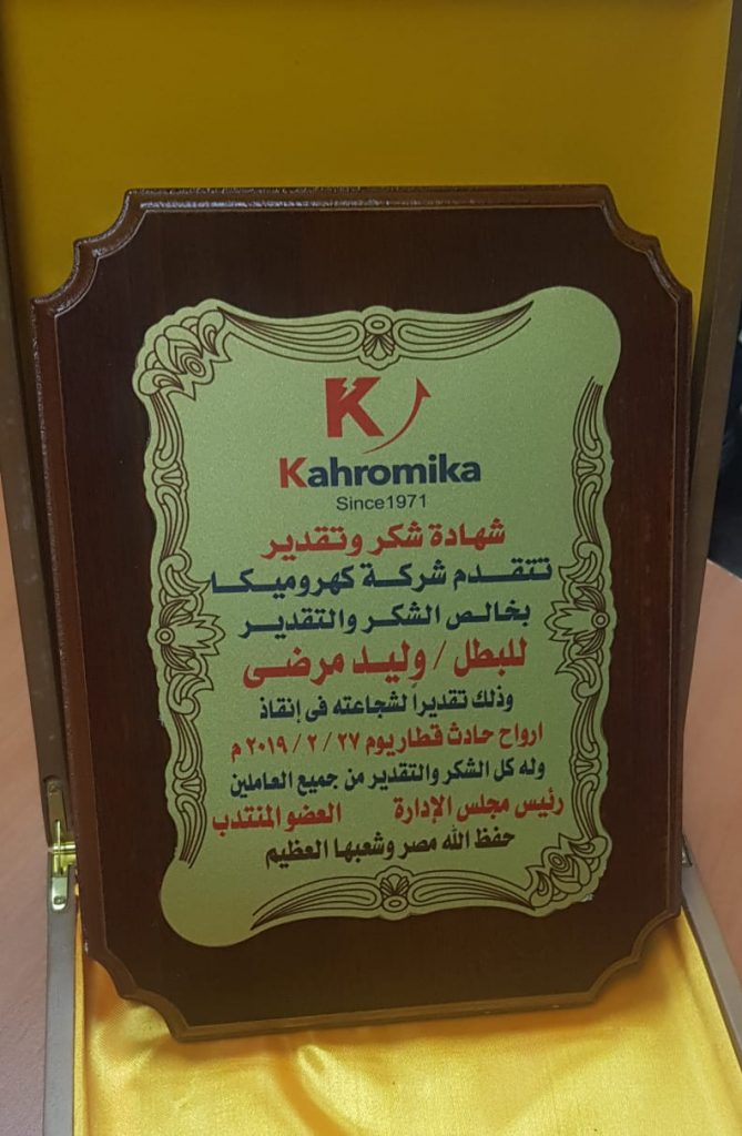 يأتي ذلك فى إطار المسئولية الاجتماعية التي تنفذها شركة كهروميكا وتقديراً منها لبطولته في إنقاذ المصابين من الاحتراق بمحطة رمسيس بإسكاب المياه على أجسادهم المشتعلة عقب الانفجار