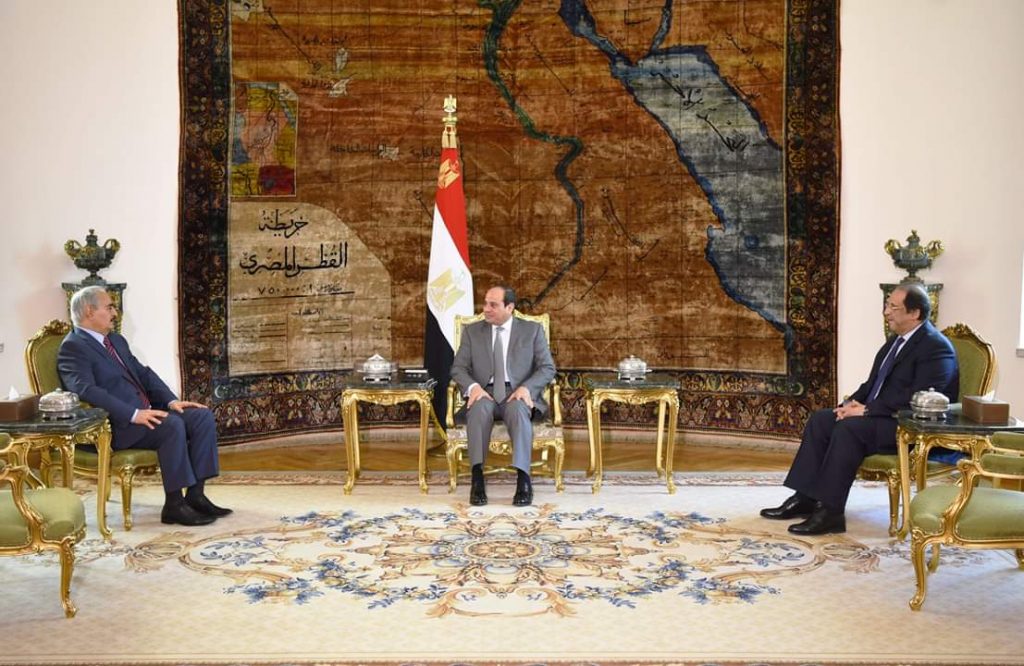 استقبل السيد الرئيس عبد الفتاح السيسي اليوم بقصر الاتحادية المشير “خليفة حفتر” القائد العام للقوات المسلحة الليبية، بحضور السيد عباس كامل رئيس المخابرات العامة.