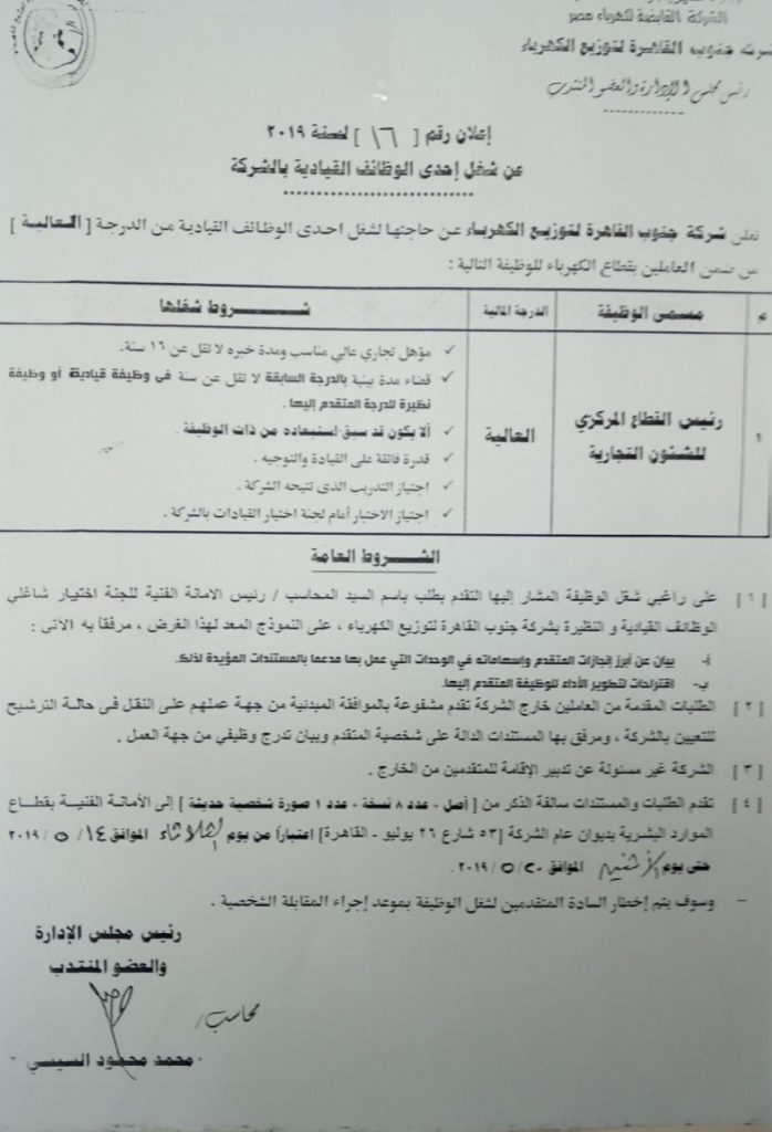 تعلن شركة جنوب القاهرة لتوزيع الكهرباء برئاسة المحاسب محمد السيسي عن حاجتها لشغل احدي الوظائف القيادية من الدرجة العليا ضمن العاملين بقطاع الكهرباء