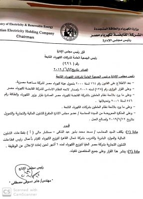 ينفرد موقع باور نيوز بنشر نص القرار رقم 221 بتاريخ اليوم لرئيس الشركة القابضة لكهرباء مصر جابر دسوقى بتكليف المحاسب مسعد محمد بشير عبدالشافى مستشار 1 بشركة شمال القاهرة للتوزيع باعمال رئيس القطاعات التجارية بشركة مصر العليا لتوزيع الكهرباء لمدة 6 اشهر لحين اعادة الاعلان عن الوظيفة