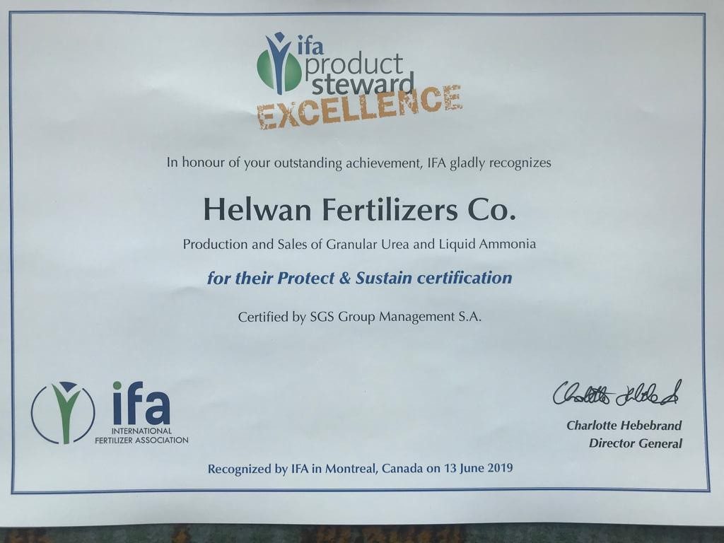 منح الاتحاد العالمي للاسمدة شركة حلوان للاسمدة شهادة الحماية والاستدامة في مجال الصحة والسلامة البيئية هى شهادة تختص بشركات الأسمدة فقط ولابد من تطبيق 5 مواصفات أيزو من أجل الحصول عليها وهى ” الجودة – البيئة – السلامة والصحة المهنية – المسؤلية المجتمعية – الأمن”