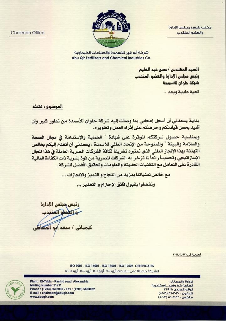 وبهذه المناسبة حرص الكيميائي سعد ابو المعاطي رئيس شركة ابو قير للاسمدة علي تقديم التهنئة بمناسبة حصول الشركة علي شهادة الحماية والاستدامة في مجال الصحة والسلامة البيئية والممنوحة من الاتحاد العالمي للاسمدة وقال ابو المعاطي “يسعدني ان اتقدم اليكم بخالص التهنئة بهذا الانجاز العالمي الذي نعتبره تشريفا لكافة الشركات المصرية العاملة في هذا المجال الاستراتيجي وتجسيدا رائعا لما تزخر به الشركات المصرية من قوة بشركة ذات الكفاءة العالية القادرة علي التعامل مع التقنيات الحديثة والمعلومات وتحقيق الافضل للشركة