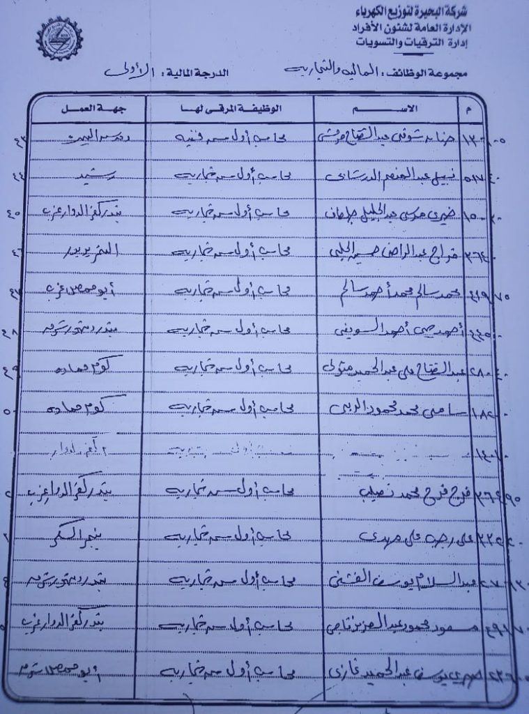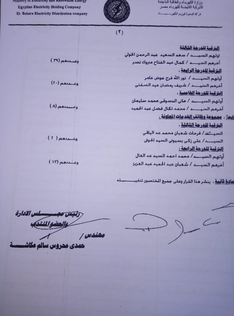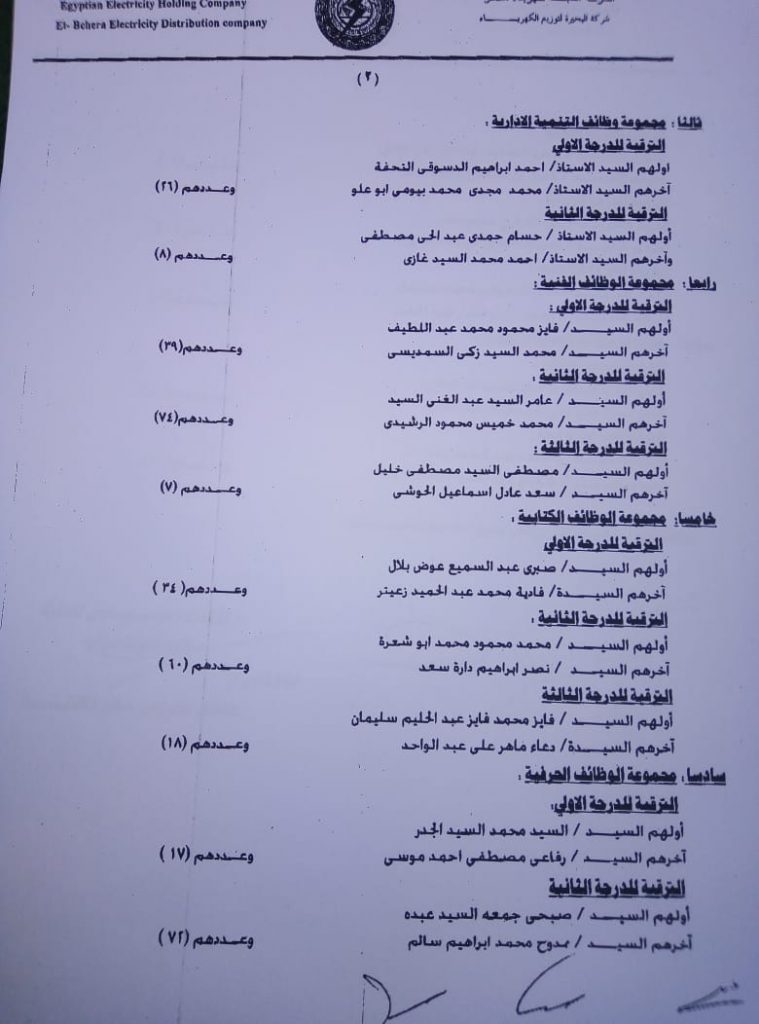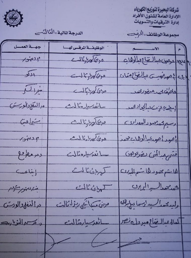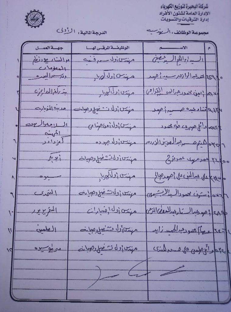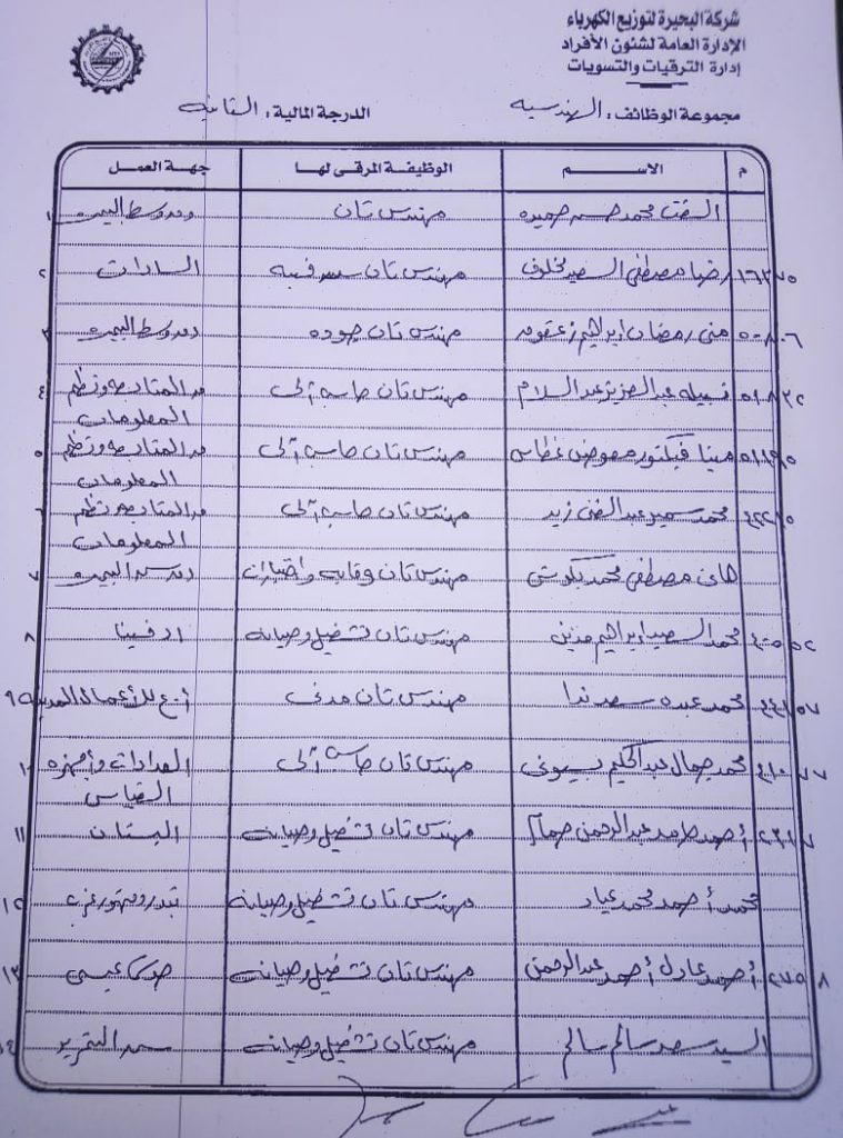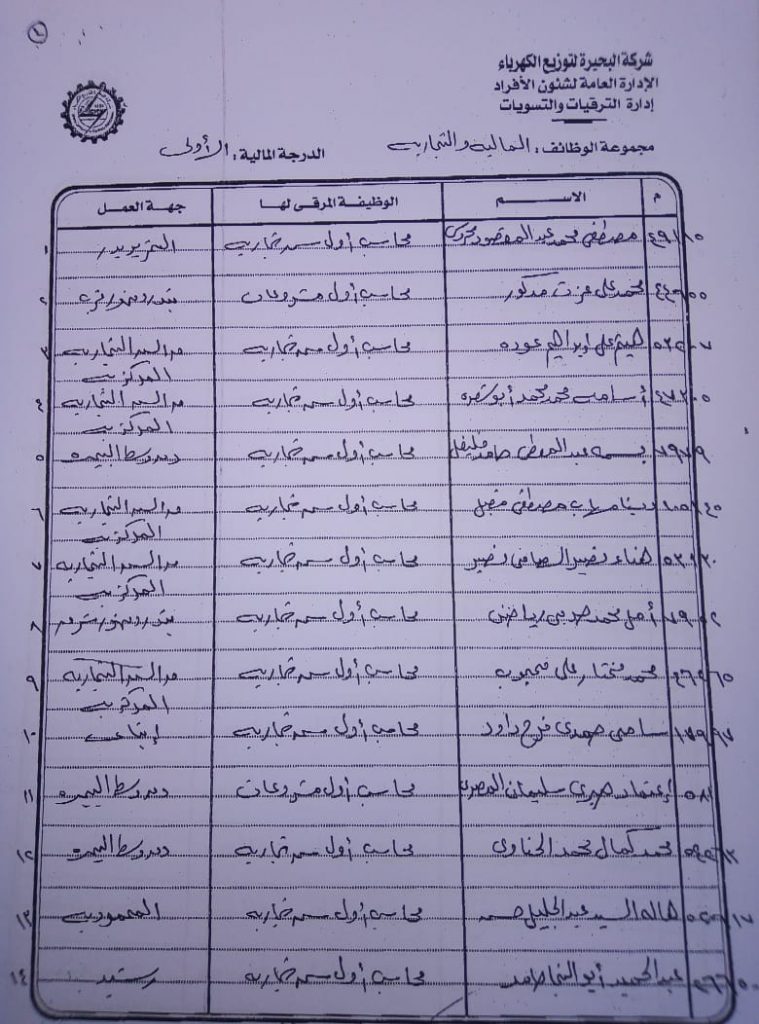 اصدر المهندس حمدي عكاشة رئيس مجلس إدارة شركة كهرباء البحيرة والعضو المنتدب قرارا بحركات ترقيات لنحو 656 عاملا بمختلف الدرجات الوظيفة الهندسية والمالية والتجارية والتنمية الادارية والوظائف الفنية والكتابية والوظائف الحرفية والخدمات المعاونة