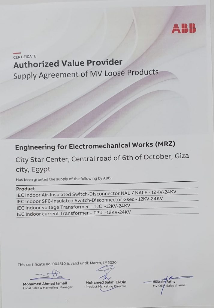 استطاعت شركة MRZ وهى الشركة الهندسية للاعمال الكهروميكانيكية تحت رئاسة المهندس مرزوق محمد على رئيس الشركة من نيل ثقة شركة ABB العالمية واعتماد الشركة بشكل رسمى كأول مصنع مصرى معتمد للوحات الجهد المتوسط فى مصر